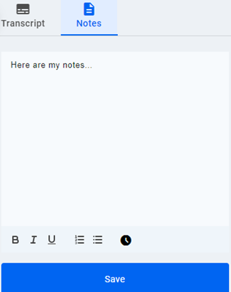 与会者可以使用“注释”选项卡来跟踪他们对会议期间讨论的内容的想法。输入笔记后,用户应点击底部的保存以记录条目。您可以随时返回会话以查看或修改您的笔记。