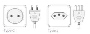 电源: 瑞士与欧洲大部分地区一样,电压为 230V/50 Hz。瑞士使用 C 型(两针)和 J 型(三针)插头。(C 型两针插头也适用于 J 型插座。)